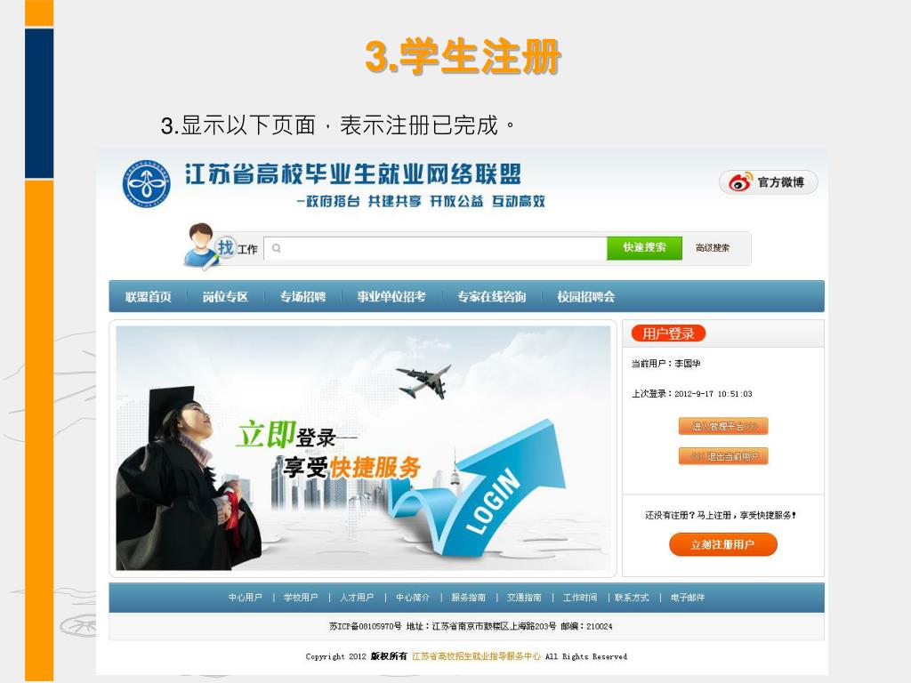 3.学生注册 登录方式:登录江苏省高校毕业生就业网络联盟(http://www.91job.gov.cn),点击“注册推荐表”链接;或直接输入网址http://tjb.91job.gov.cn