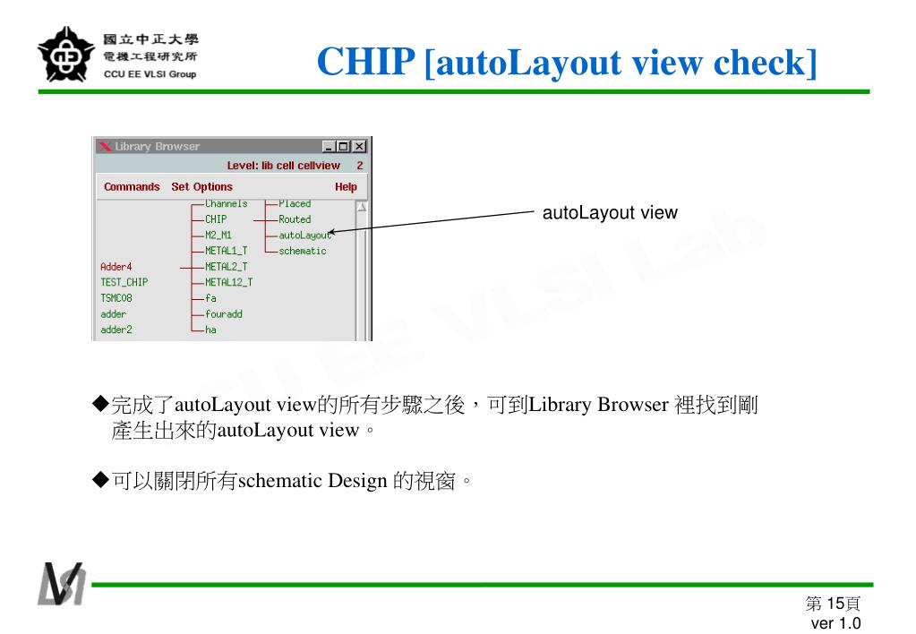 autoLayout view • 完成了autoLayout view的所有步驟之後,可到Library Browser 裡找到剛 • 產生出來的autoLayout view。 • 可以關閉所有schematic Design 的視窗。 CHIP [autoLayout view check]