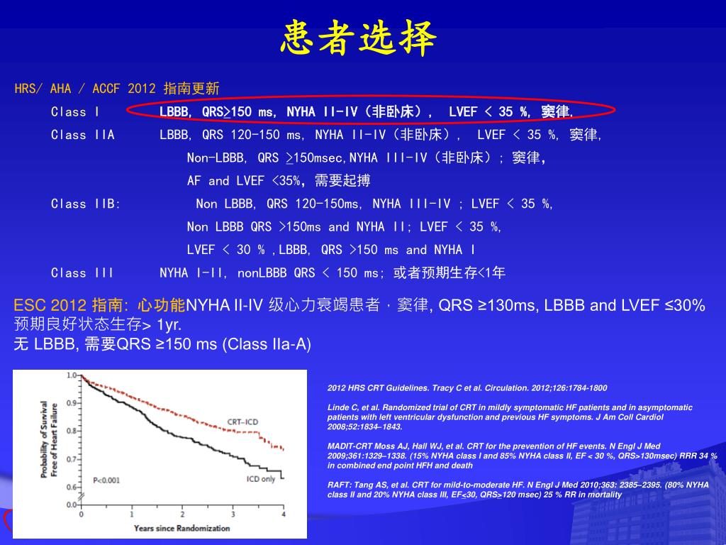 HRS/ AHA / ACCF 2012 指南更新 Class ILBBB, QRS>150 ms, NYHA II-IV(非卧床), LVEF < 35 %, 窦律, Class IIA LBBB, QRS 120-150 ms, NYHA II-IV(非卧床), LVEF < 35 %, 窦律, Non-LBBB, QRS >150msec,NYHA III-IV(非卧床); 窦律, AF and LVEF <35%,需要起搏 Class IIB: Non LBBB, QRS 120-150ms, NYHA III-IV ; LVEF < 35 %, Non LBBB QRS >150ms and NYHA II; LVEF < 35 %, LVEF < 30 % ,LBBB, QRS >150 ms and NYHA I Class III NYHA I-II, nonLBBB QRS < 150 ms; 或者预期生存<1年 ESC 2012 指南: 心功能NYHA II-IV 级心力衰竭患者,窦律, QRS ≥130ms, LBBB and LVEF ≤30% 预期良好状态生存> 1yr. 无LBBB, 需要QRS ≥150 ms (Class IIa-A) 患者选择 2012 HRS CRT Guidelines. Tracy C et al. Circulation. 2012;126:1784-1800 Linde C, et al. Randomized trial of CRT in mildly symptomatic HF patients and in asymptomatic patients with left ventricular dysfunction and previous HF symptoms. J Am Coll Cardiol 2008;52:1834–1843. MADIT-CRT Moss AJ, Hall WJ, et al. CRT for the prevention of HF events. N Engl J Med 2009;361:1329–1338. (15% NYHA class I and 85% NYHA class II, EF < 30 %, QRS>130msec) RRR 34 % in combined end point HFH and death RAFT: Tang AS, et al. CRT for mild-to-moderate HF. N Engl J Med 2010;363: 2385–2395. (80% NYHA class II and 20% NYHA class III, EF<30, QRS>120 msec) 25 % RR in mortality