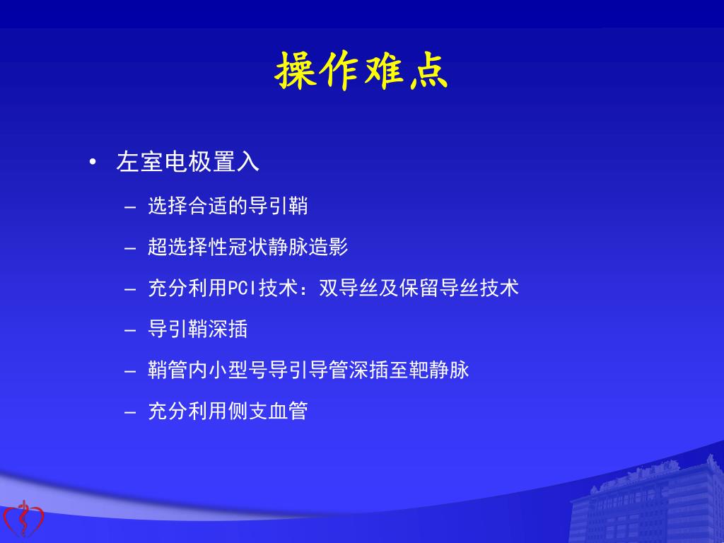 操作难点 • 左室电极置入 • 选择合适的导引鞘 • 超选择性冠状静脉造影 • 充分利用PCI技术:双导丝及保留导丝技术 • 导引鞘深插 • 鞘管内小型号导引导管深插至靶静脉 • 充分利用侧支血管
