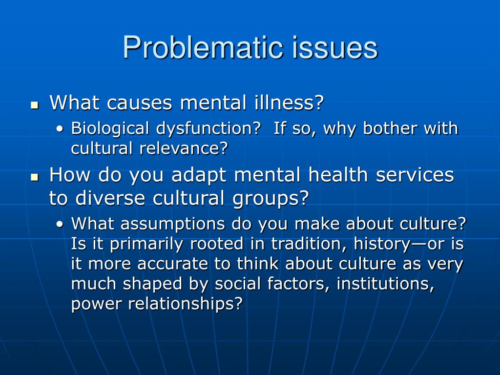 Problematic issues • What causes mental illness? • Biological dysfunction? If so, why bother with cultural relevance? • How do you adapt mental health services to diverse cultural groups? • What assumptions do you make about culture? Is it primarily rooted in tradition, history—or is it more accurate to think about culture as very much shaped by social factors, institutions, power relationships?