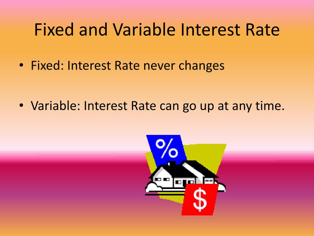 Fixed and Variable Interest Rate • Fixed: Interest Rate never changes • Variable: Interest Rate can go up at any time.