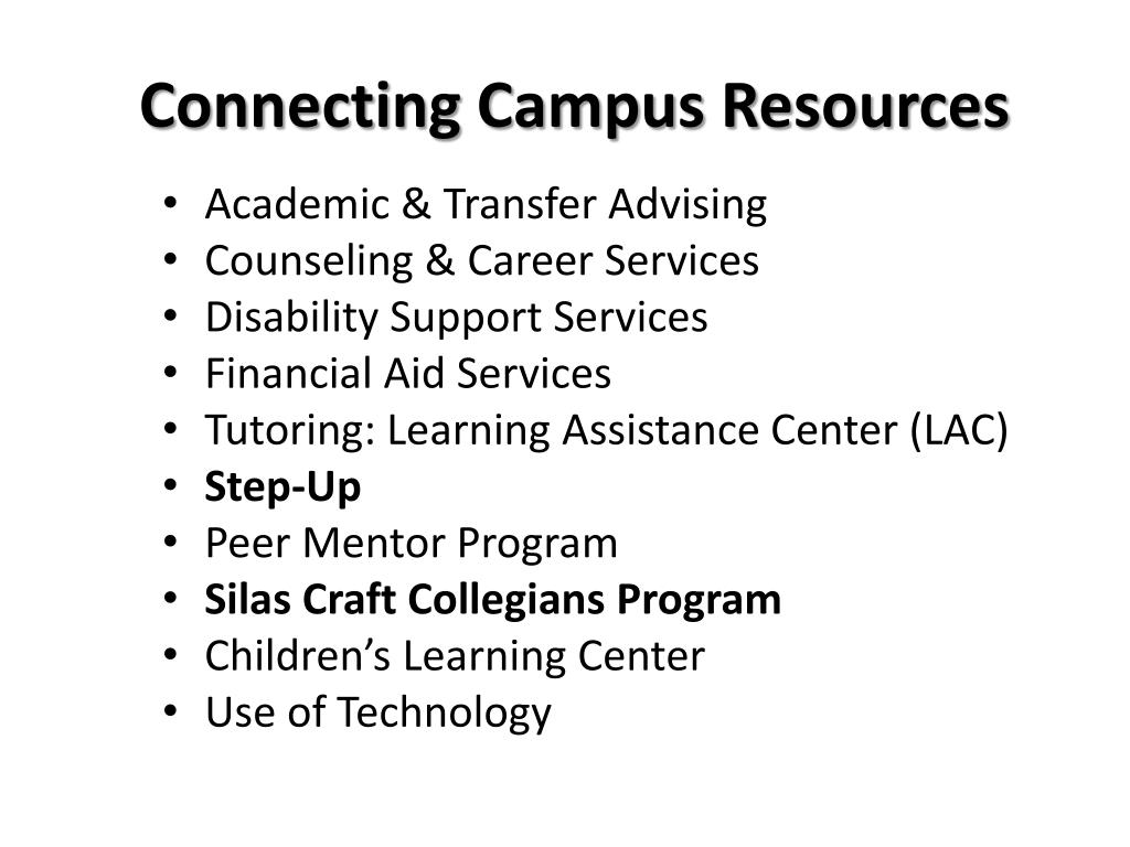 Connecting Campus Resources • Academic & Transfer Advising • Counseling & Career Services • Disability Support Services • Financial Aid Services • Tutoring: Learning Assistance Center (LAC) • Step-Up • Peer Mentor Program • Silas Craft Collegians Program • Children’s Learning Center • Use of Technology