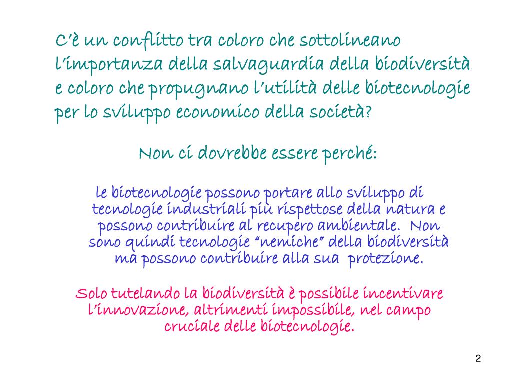 C’è un conflitto tra coloro che sottolineano l’importanza della salvaguardia della biodiversità e coloro che propugnano l’utilità delle biotecnologie per lo sviluppo economico della società? Non ci dovrebbe essere perché: le biotecnologie possono portare allo sviluppo di tecnologie industriali più rispettose della natura e possono contribuire al recupero ambientale. Non sono quindi tecnologie “nemiche” della biodiversità ma possono contribuire alla sua protezione. Solo tutelando la biodiversità è possibile incentivare l’innovazione, altrimenti impossibile, nel campo cruciale delle biotecnologie.