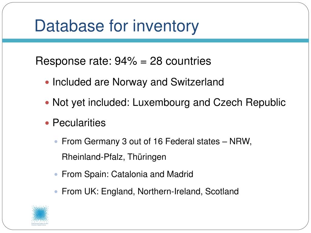 Database for inventory Response rate: 94% = 28 countries • Included are Norway and Switzerland • Not yet included: Luxembourg and Czech Republic • Pecularities • From Germany 3 out of 16 Federal states – NRW, Rheinland-Pfalz, Thüringen • From Spain: Catalonia and Madrid • From UK: England, Northern-Ireland, Scotland