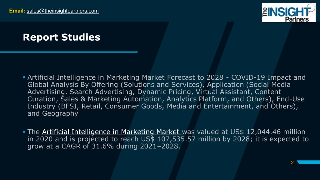 Email: sales@theinsightpartners.com Report Studies Artificial Intelligence in Marketing Market Forecast to 2028 - COVID-19 Impact and Global Analysis By Offering (Solutions and Services), Application (Social Media Advertising, Search Advertising, Dynamic Pricing, Virtual Assistant, Content Curation, Sales & Marketing Automation, Analytics Platform, and Others), End-Use Industry (BFSI, Retail, Consumer Goods, Media and Entertainment, and Others), and Geography The Artificial Intelligence in Marketing Market was valued at US$ 12,044.46 million in 2020 and is projected to reach US$ 107,535.57 million by 2028; it is expected to grow at a CAGR of 31.6% during 2021–2028. 2