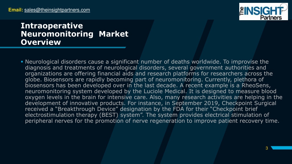 Email: sales@theinsightpartners.com Intraoperative Neuromonitoring Market Overview Neurological disorders cause a significant number of deaths worldwide. To improvise the diagnosis and treatments of neurological disorders, several government authorities and organizations are offering financial aids and research platforms for researchers across the globe. Biosensors are rapidly becoming part of neuromonitoring. Currently, plethora of biosensors has been developed over in the last decade. A recent example is a RheoSens, neuromonitoring system developed by the Luciole Medical. It is designed to measure blood oxygen levels in the brain for intensive care. Also, many research activities are helping in the development of innovative products. For instance, in September 2019, Checkpoint Surgical received a “Breakthrough Device” designation by the FDA for their “Checkpoint brief electrostimulation therapy (BEST) system”. The system provides electrical stimulation of peripheral nerves for the promotion of nerve regeneration to improve patient recovery time. 3