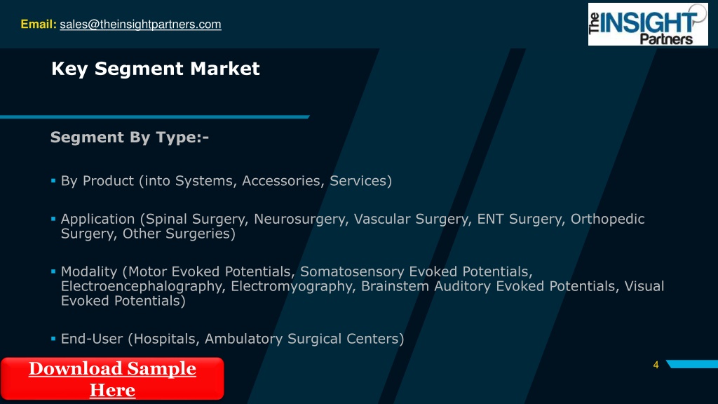 Email: sales@theinsightpartners.com Key Segment Market Segment By Type:- By Product (into Systems, Accessories, Services) Application (Spinal Surgery, Neurosurgery, Vascular Surgery, ENT Surgery, Orthopedic Surgery, Other Surgeries) Modality (Motor Evoked Potentials, Somatosensory Evoked Potentials, Electroencephalography, Electromyography, Brainstem Auditory Evoked Potentials, Visual Evoked Potentials) End-User (Hospitals, Ambulatory Surgical Centers) Download Sample Here 4