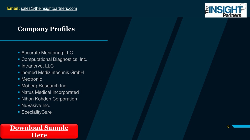 Email: sales@theinsightpartners.com Company Profiles Accurate Monitoring LLC Computational Diagnostics, Inc. Intranerve, LLC inomed Medizintechnik GmbH Medtronic Moberg Research Inc. Natus Medical Incorporated Nihon Kohden Corporation NuVasive Inc. SpecialityCare Download Sample Here 6
