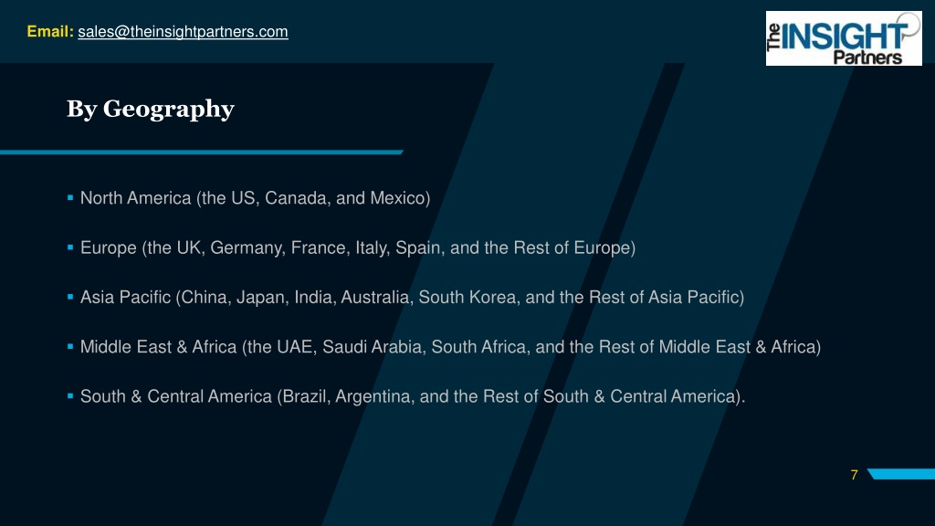 Email: sales@theinsightpartners.com By Geography North America (the US, Canada, and Mexico) Europe (the UK, Germany, France, Italy, Spain, and the Rest of Europe) Asia Pacific (China, Japan, India, Australia, South Korea, and the Rest of Asia Pacific) Middle East & Africa (the UAE, Saudi Arabia, South Africa, and the Rest of Middle East & Africa) South & Central America (Brazil, Argentina, and the Rest of South & Central America). 7