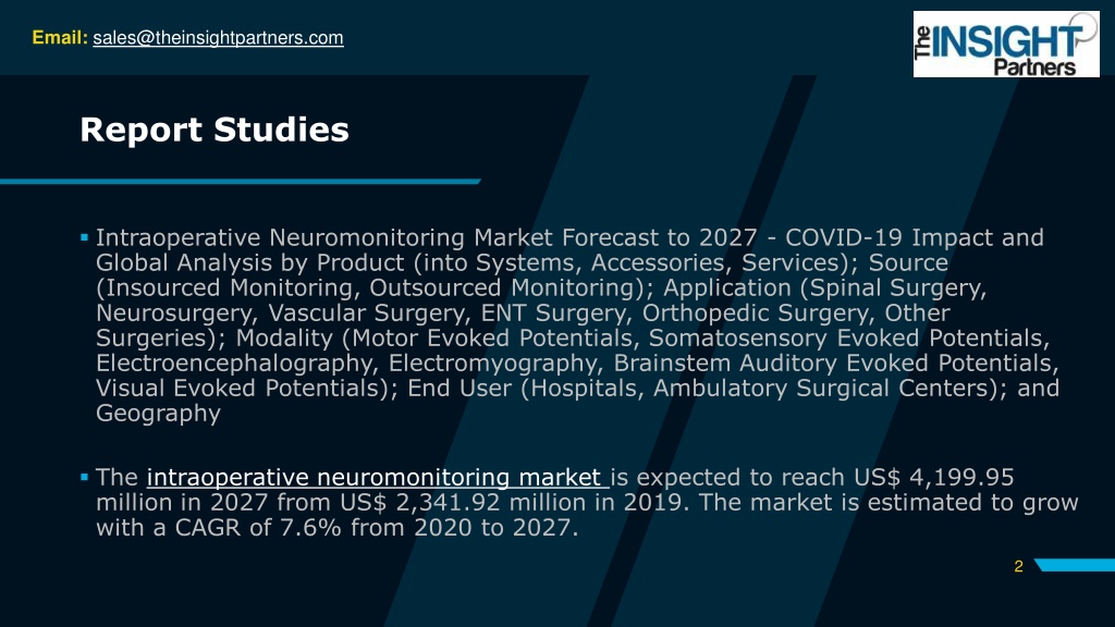 Email: sales@theinsightpartners.com Report Studies Intraoperative Neuromonitoring Market Forecast to 2027 - COVID-19 Impact and Global Analysis by Product (into Systems, Accessories, Services); Source (Insourced Monitoring, Outsourced Monitoring); Application (Spinal Surgery, Neurosurgery, Vascular Surgery, ENT Surgery, Orthopedic Surgery, Other Surgeries); Modality (Motor Evoked Potentials, Somatosensory Evoked Potentials, Electroencephalography, Electromyography, Brainstem Auditory Evoked Potentials, Visual Evoked Potentials); End User (Hospitals, Ambulatory Surgical Centers); and Geography The intraoperative neuromonitoring market is expected to reach US$ 4,199.95 million in 2027 from US$ 2,341.92 million in 2019. The market is estimated to grow with a CAGR of 7.6% from 2020 to 2027. 2