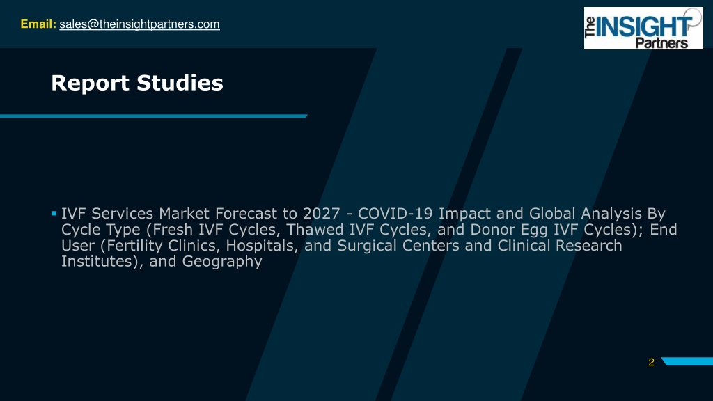 Email: sales@theinsightpartners.com Report Studies IVF Services Market Forecast to 2027 - COVID-19 Impact and Global Analysis By Cycle Type (Fresh IVF Cycles, Thawed IVF Cycles, and Donor Egg IVF Cycles); End User (Fertility Clinics, Hospitals, and Surgical Centers and Clinical Research Institutes), and Geography 2