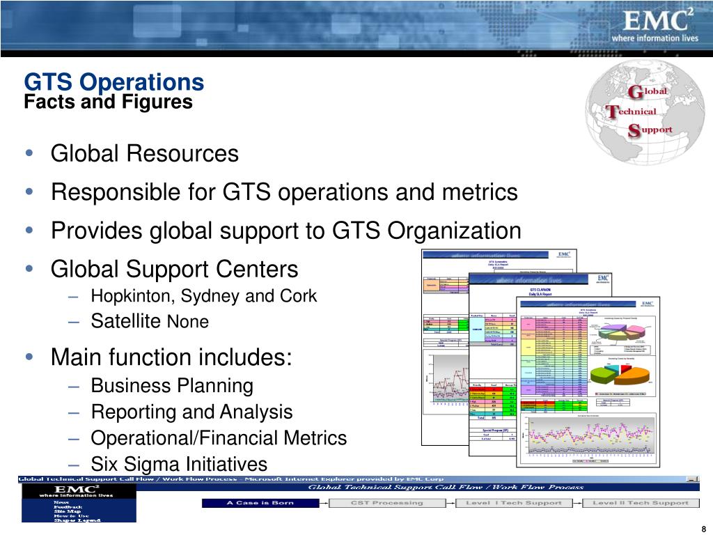 GTS Operations Facts and Figures • Global Resources • Responsible for GTS operations and metrics • Provides global support to GTS Organization • Global Support Centers • Hopkinton, Sydney and Cork • Satellite None • Main function includes: • Business Planning • Reporting and Analysis • Operational/Financial Metrics • Six Sigma Initiatives