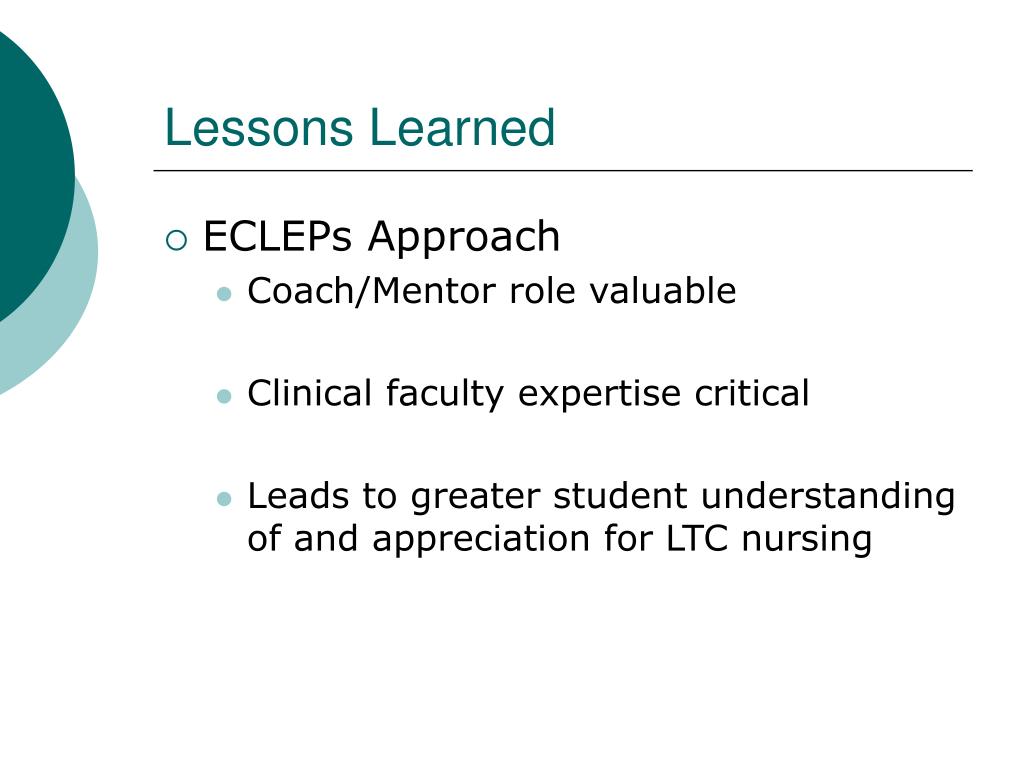 Lessons Learned • ECLEPs Approach • Coach/Mentor role valuable • Clinical faculty expertise critical • Leads to greater student understanding of and appreciation for LTC nursing