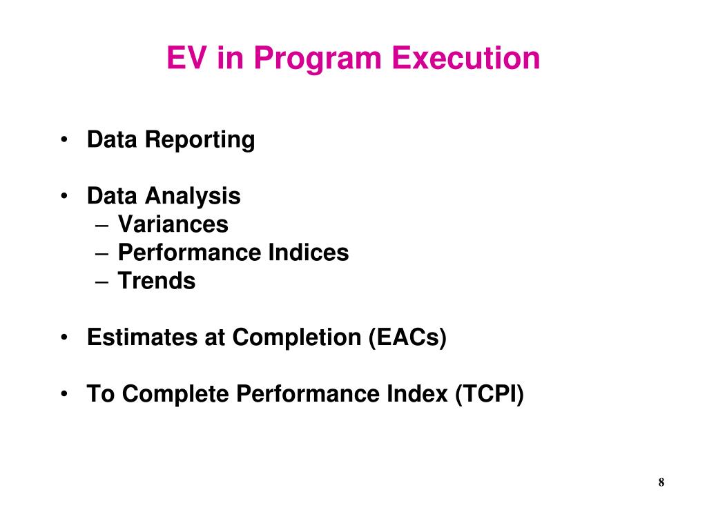 EV in Program Execution • Data Reporting • Data Analysis • Variances • Performance Indices • Trends • Estimates at Completion (EACs) • To Complete Performance Index (TCPI)