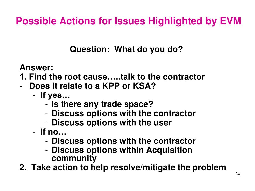 Possible Actions for Issues Highlighted by EVM Question: What do you do? Answer: 1. Find the root cause…..talk to the contractor • Does it relate to a KPP or KSA? • If yes… • Is there any trade space? • Discuss options with the contractor • Discuss options with the user • If no… • Discuss options with the contractor • Discuss options within Acquisition community 2. Take action to help resolve/mitigate the problem