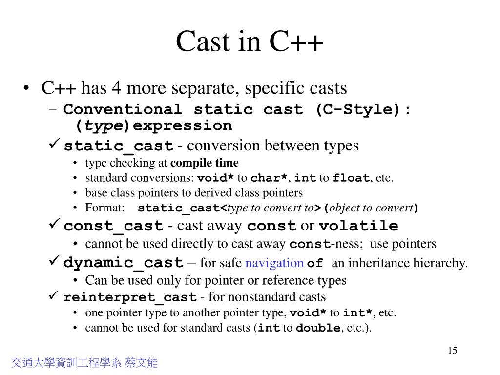Cast in C++ • C++ has 4 more separate, specific casts • Conventional static cast (C-Style): (type)expression • static_cast - conversion between types • type checking at compile time • standard conversions: void* to char*, int to float, etc. • base class pointers to derived class pointers • Format: static_cast<type to convert to>(object to convert) • const_cast - cast away const or volatile • cannot be used directly to cast away const-ness; use pointers • dynamic_cast – for safe navigationof an inheritance hierarchy. • Can be used only for pointer or reference types • reinterpret_cast - for nonstandard casts • one pointer type to another pointer type, void* to int*, etc. • cannot be used for standard casts (int to double, etc.). 交通大學資訓工程學系 蔡文能