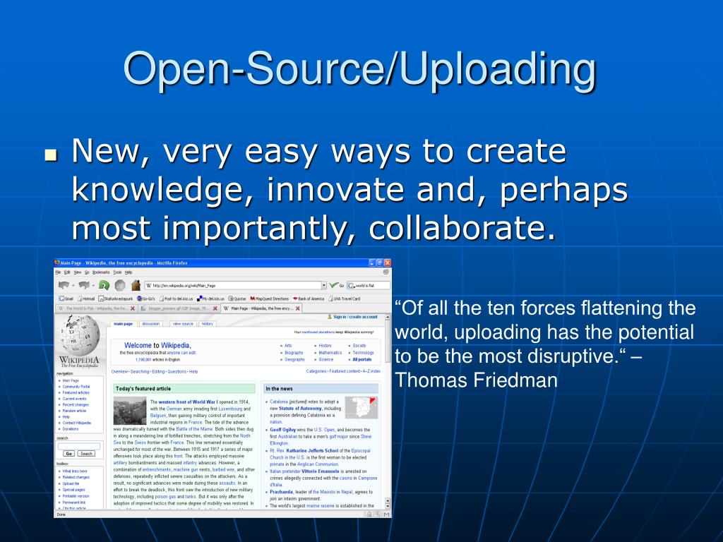 Open-Source/Uploading • New, very easy ways to create knowledge, innovate and, perhaps most importantly, collaborate. “Of all the ten forces flattening the world, uploading has the potential to be the most disruptive.“ – Thomas Friedman
