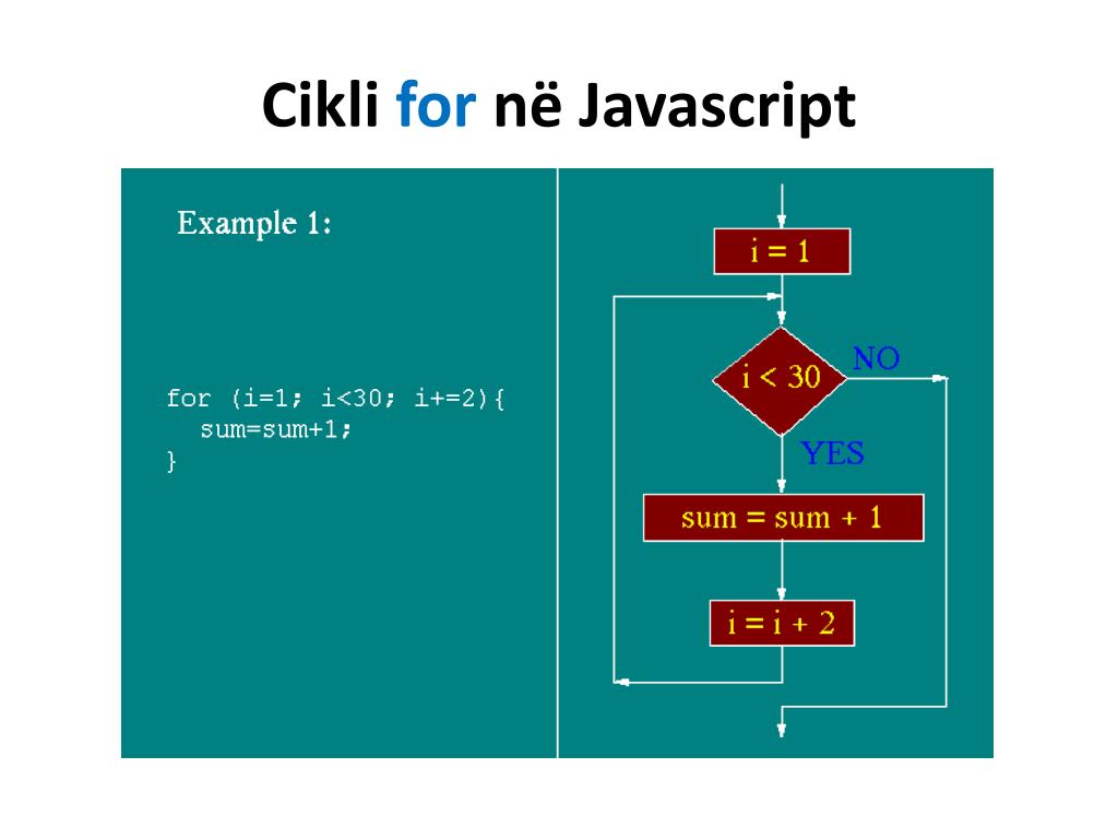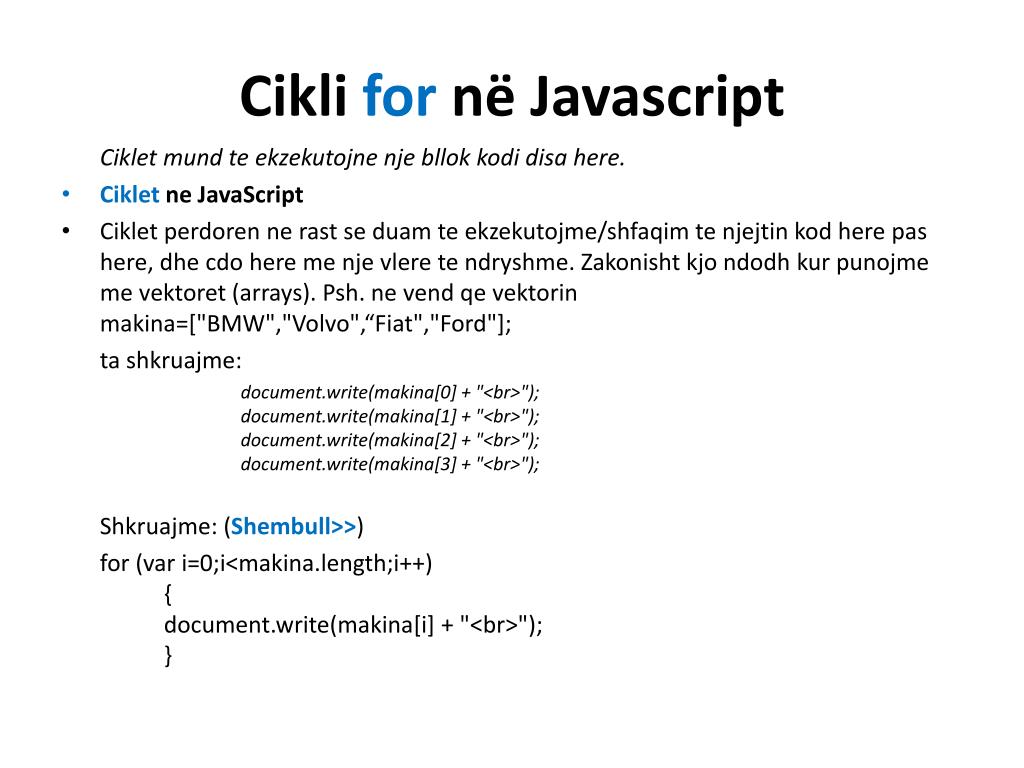 CiklifornëJavascript Cikletmundteekzekutojnenjebllokkodidisa here. • Cikletne JavaScript • Cikletperdoren ne rast se duamteekzekutojme/shfaqimtenjejtinkod here pas here, dhecdo here me njevleretendryshme. Zakonishtkjondodhkurpunojme me vektoret (arrays). Psh. ne vend qevektorinmakina=["BMW","Volvo",“Fiat","Ford"]; tashkruajme: document.write(makina[0] + "<br>"); document.write(makina[1] + "<br>"); document.write(makina[2] + "<br>"); document.write(makina[3] + "<br>"); Shkruajme: (Shembull>>) for (vari=0;i<makina.length;i++) { document.write(makina[i] + "<br>"); }
