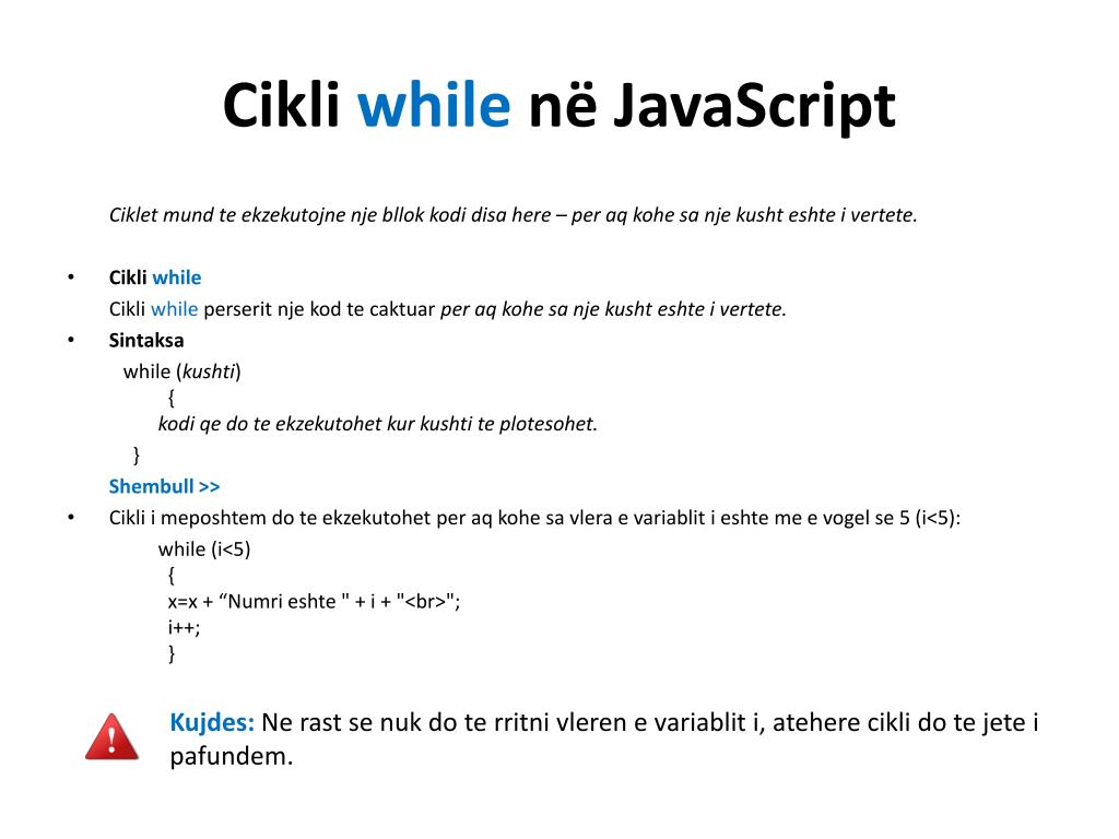 Cikliwhilenë JavaScript Cikletmundteekzekutojnenjebllokkodidisa here – per aqkohesanjekushteshteivertete. • Cikliwhile Cikli whileperseritnjekodtecaktuarper aqkohesanjekushteshteivertete. • Sintaksa while (kushti) {kodiqe do teekzekutohetkurkushtiteplotesohet. } Shembull >> • Cikliimeposhtem do teekzekutohet per aqkohesavlera e variablitieshte me e vogel se 5 (i<5): while (i<5) { x=x + “Numrieshte " + i + "<br>";i++; } Kujdes: Ne rast se nuk do territnivleren e variabliti, ateherecikli do tejeteipafundem.