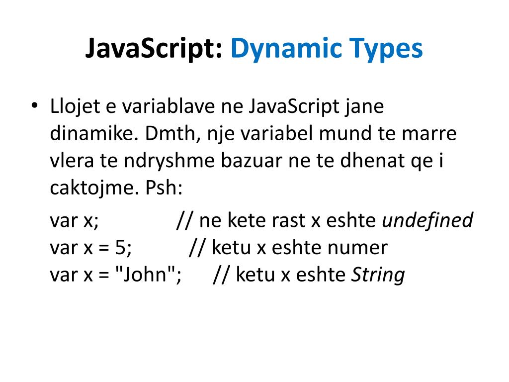 JavaScript: Dynamic Types • Llojet e variablave ne JavaScript janedinamike. Dmth, njevariabelmundtemarrevleratendryshmebazuar ne tedhenatqeicaktojme. Psh: varx; // ne keterast x eshteundefinedvar x = 5; // ketux eshtenumervar x = "John"; // ketu x eshteString