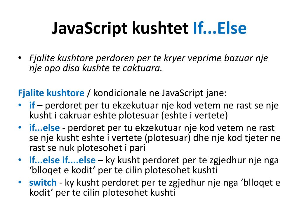 JavaScript kushtetIf...Else • Fjalitekushtoreperdoren per tekryerveprimebazuarnjenjeapodisakushtetecaktuara. Fjalitekushtore/ kondicionale ne JavaScript jane: • if– perdoret per tuekzekutuarnjekodvetem ne rast se njekushticakruareshteplotesuar (eshteivertete) • if...else - perdoret per tuekzekutuarnjekodvetem ne rast se njekushteshteivertete (plotesuar) dhenjekodtjeter ne rast se nukplotesohetipari • if...else if....else – kykushtperdoret per tezgjedhurnjenga ‘blloqet e kodit’ per tecilinplotesohetkushti • switch- kykushtperdoret per tezgjedhurnjenga ‘blloqet e kodit’ per tecilinplotesohetkushti
