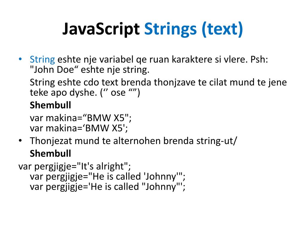 JavaScript Strings (text) • Stringeshtenjevariabelqeruankarakteresivlere. Psh: "John Doe“ eshtenje string. String eshtecdo text brendathonjzavetecilatmundtejenetekeapodyshe. (‘’ ose “”) Shembull varmakina=“BMW X5";varmakina=‘BMW X5'; • Thonjezatmundtealternohenbrenda string-ut/ Shembull varpergjigje="It's alright";varpergjigje="He is called 'Johnny'";varpergjigje='He is called "Johnny"';