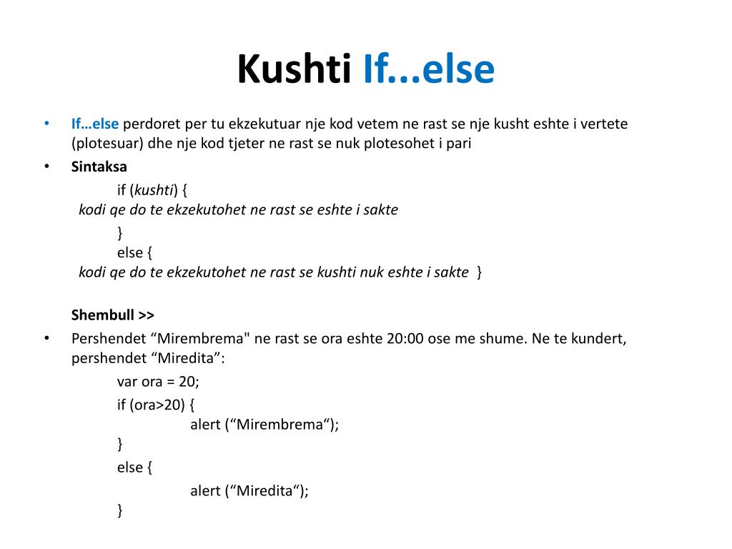 KushtiIf • if– perdoret per tuekzekutuarnjekodvetem ne rast se njekushticakruareshteplotesuar (eshteivertete) • Sintaksa if (kushti) {kodiqe do teekzekutohet ne rast se plotesohetkushtiimesiperm } Kujdes: Kushtiifshkruhet me germatevogla (lowercase). Ne rast se e shkruajme me germakapitale do tekemitebejme me JavaScript error! Shembull >> Pershendet “Mirembrema" ne rast se oraeshte 20:00 ose me shume. varora = 20; if (ora>20) { alert (“Mirembrema“); } Vini re: Ne keterastnukkemi ..else.. Kjo do tethote se browseri do teekzekutojekodinvetem ne rast se kushti ne if zbatohet.