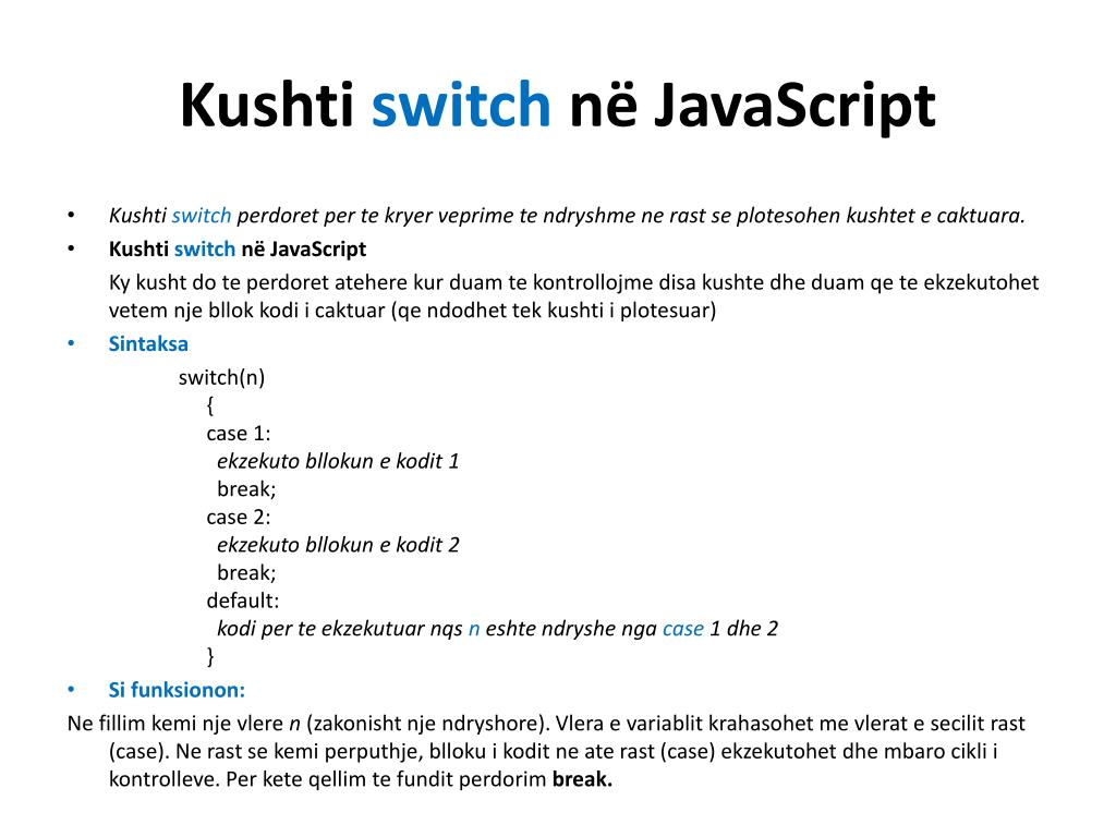 Kushtiswitchnë JavaScript • Kushtiswitchperdoret per tekryerveprimetendryshme ne rast se plotesohenkushtet e caktuara. • Kushtiswitchnë JavaScript Kykusht do teperdoretateherekurduamtekontrollojmedisakushtedheduamqeteekzekutohetvetemnjebllokkodiicaktuar (qendodhettekkushtiiplotesuar) • Sintaksa switch(n){case 1:ekzekutobllokun e kodit 1 break;case 2:ekzekutobllokun e kodit 2 break;default:kodi per teekzekutuarnqsneshtendryshengacase 1 dhe 2} • Si funksionon: Ne fillimkeminjevleren (zakonishtnjendryshore). Vlera e variablitkrahasohet me vlerat e secilitrast (case). Ne rast se kemiperputhje, bllokuikodit ne ate rast (case) ekzekutohetdhembarocikliikontrolleve. Per keteqellimtefunditperdorimbreak.