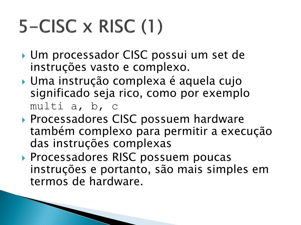 5-CISC x RISC (1) • Um processador CISC possui um set de instruções vasto e complexo. • Uma instrução complexa é aquela cujo significado seja rico, como por exemplo multi a, b, c • Processadores CISC possuem hardware também complexo para permitir a execução das instruções complexas • Processadores RISC possuem poucas instruções e portanto, são mais simples em termos de hardware.