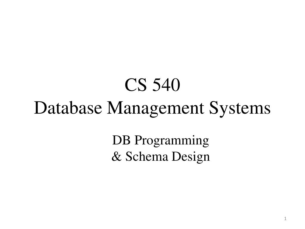 CS 540 Database Management Systems. DB Programming & Schema Design. Relational Database Management. Database Programming. Physical Storage . Conceptual Design. Schema. Relational Model. Entity Relationship(ER) Model. Files and Indexes. Is SQL Sufficient?.