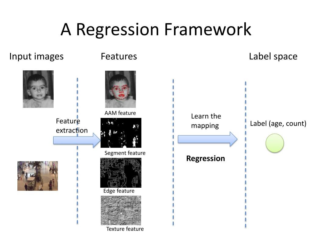 A Regression Framework Input images Features Label space AAM feature Learn the mapping Feature extraction Label (age, count) Segment feature Regression Edge feature Texture feature
