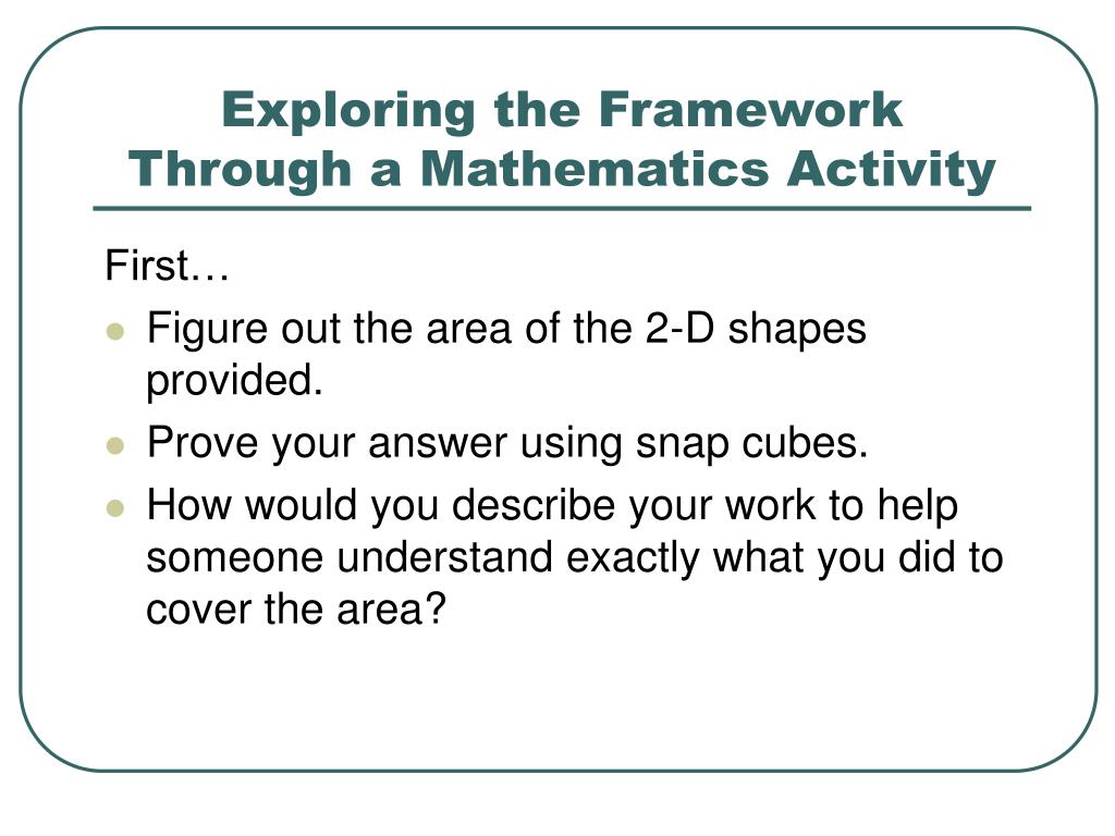 Exploring the Framework Through a Mathematics Activity First… • Figure out the area of the 2-D shapes provided. • Prove your answer using snap cubes. • How would you describe your work to help someone understand exactly what you did to cover the area?