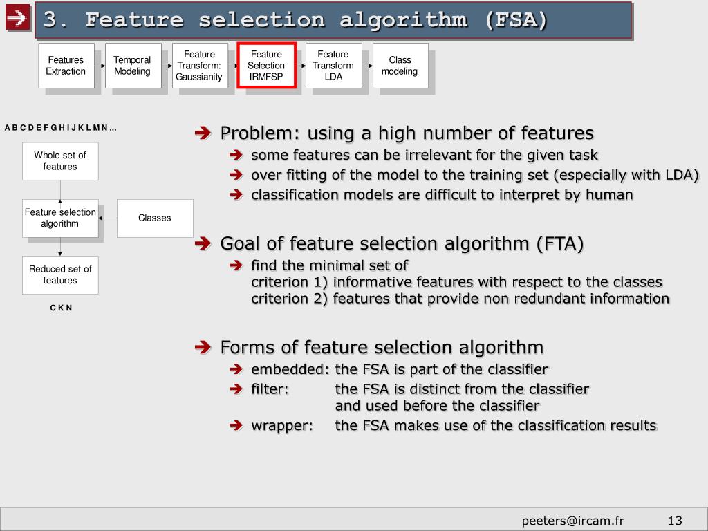 2. Feature extraction • Features for sound recognition: • speech recognition community, previous studies on musical instrument sounds classification, results of psycho-acoustical studies. • each feature set is supposed to perform well for a specific task • Principle: • 1) extract a large set of features • 2) filter the feature set a posteriori by a Feature Selection Algorithm
