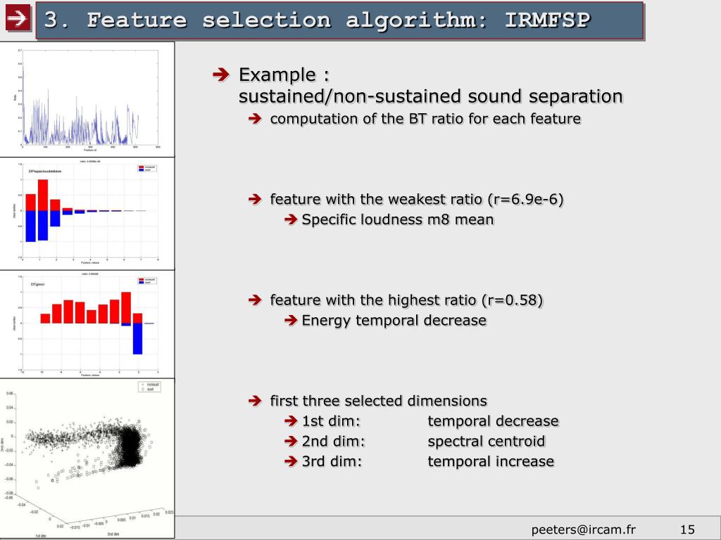 3. Feature selection algorithm: IRMFSP • Example :sustained/non-sustained sound separation • computation of the BT ratio for each feature • feature with the weakest ratio (r=6.9e-6) • Specific loudness m8 mean • feature with the highest ratio (r=0.58) • Energy temporal decrease • first three selected dimensions • 1st dim: temporal decrease • 2nd dim: spectral centroid • 3rd dim: temporal increase