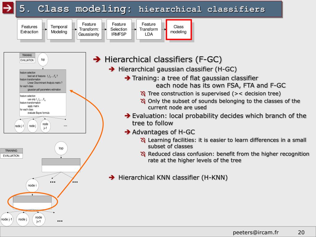 5. Class modeling: flat classifiers • Flat classifiers • Flat gaussian classifier (F-GC) • “Flat”= all classes considered on a same level • Training: model each class k by a multi-dimensional gaussian pdf (mean vector, covariance matrix) • Evaluation: Bayes formula • Flat KNN classifier (F-KNN) • instance-based algorithm • assign to the input sound the majority class among its K Nearest Neighbors in the Feature Space • Euclidean distance => weighting of the axes ? • Apply to the output of the LDA (implicit weighting of the axes)