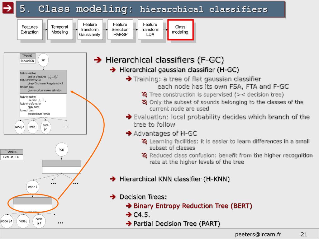 5. Class modeling: hierarchical classifiers • Hierarchical classifiers (F-GC) • Hierarchical gaussian classifier (H-GC) • Training: a tree of flat gaussian classifier each node has its own FSA, FTA and F-GC • Tree construction is supervised (>< decision tree) • Only the subset of sounds belonging to the classes of the current node are used • Evaluation: local probability decides which branch of the tree to follow • Advantages of H-GC • Learning facilities: it is easier to learn differences in a small subset of classes • Reduced class confusion: benefit from the higher recognition rate at the higher levels of the tree • Hierarchical KNN classifier (H-KNN) • Decision Trees: • Binary Entropy Reduction Tree (BERT) • C4.5. • Partial Decision Tree (PART)