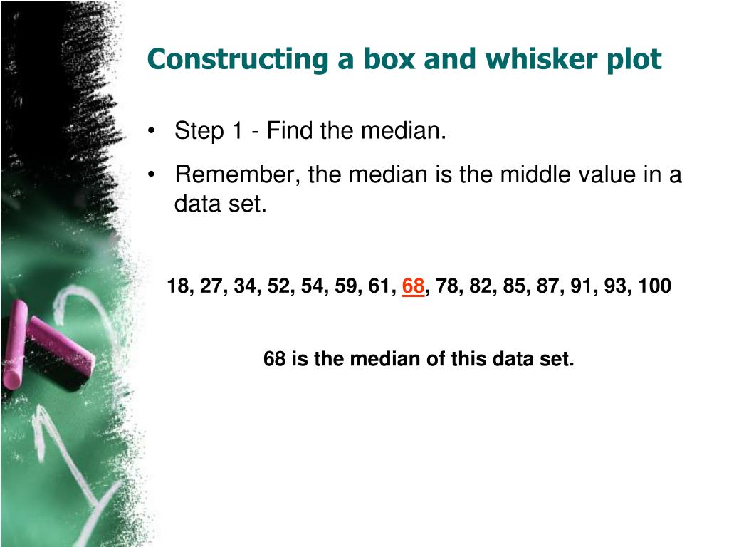 Constructing a box and whisker plot • Step 1 - Find the median. • Remember, the median is the middle value in a data set. 18, 27, 34, 52, 54, 59, 61, 68, 78, 82, 85, 87, 91, 93, 100 68 is the median of this data set.