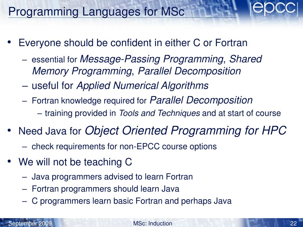 Programming Languages for MSc • Everyone should be confident in either C or Fortran • essential for Message-Passing Programming, Shared Memory Programming, Parallel Decomposition • useful for Applied Numerical Algorithms • Fortran knowledge required for Parallel Decomposition • training provided in Tools and Techniques and at start of course • Need Java for Object Oriented Programming for HPC • check requirements for non-EPCC course options • We will not be teaching C • Java programmers advised to learn Fortran • Fortran programmers should learn Java • C programmers learn basic Fortran and perhaps Java MSc: Induction