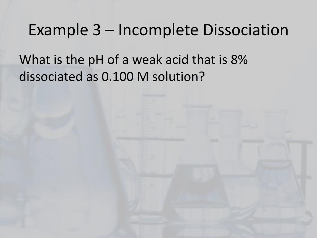 Example 3 – Incomplete Dissociation What is the pHof a weak acid that is 8% dissociated as 0.100 M solution?