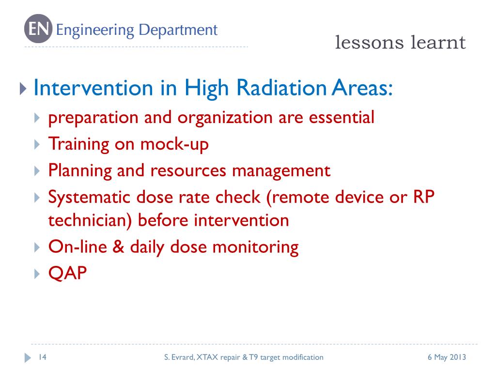 lessonslearnt • Intervention in High Radiation Areas: • preparation and organization are essential • Training on mock-up • Planning and resources management • Systematic dose rate check (remote device or RP technician) before intervention • On-line & daily dose monitoring • QAP S. Evrard, XTAX repair & T9 target modification