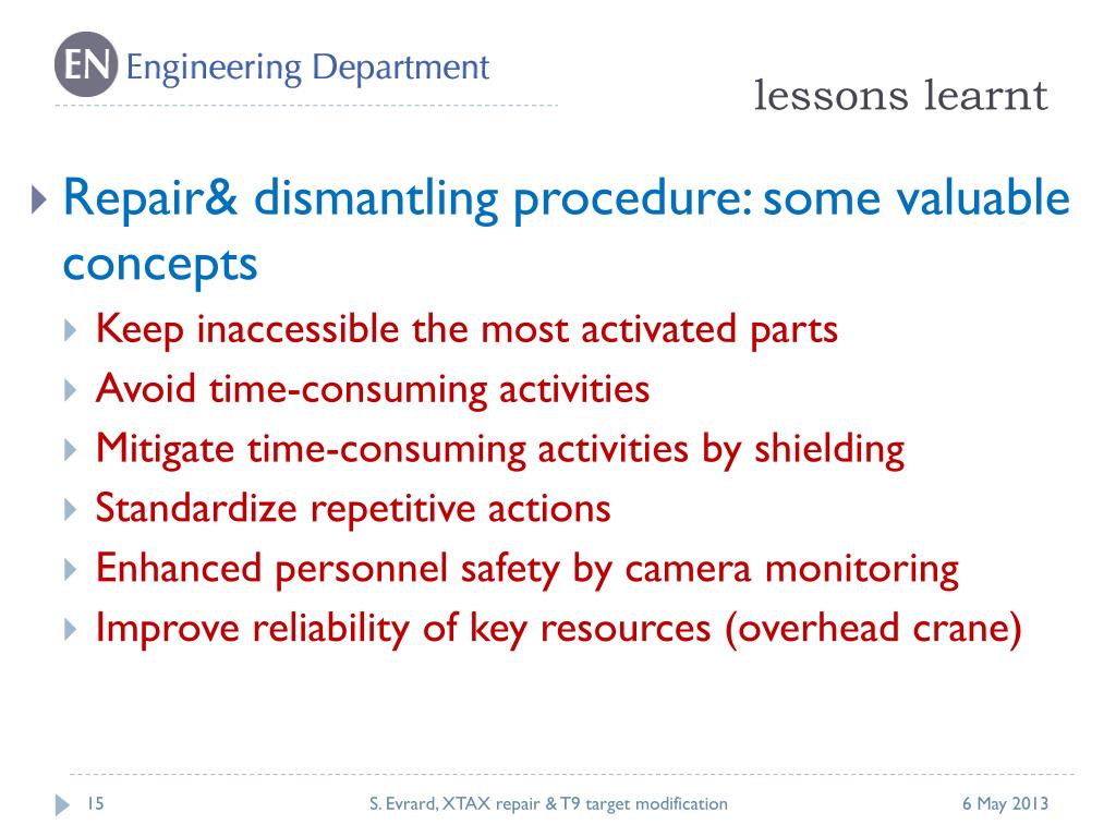 lessonslearnt • Design of High Radiation Areas • Take into account dismantling needs as from the design stage • Include dedicated areas in TA for remote handling operation, RP supervision (preparation, monitoring,…) • Equip underground areas with most recent technology means (optical fibers, cable network for cameras, Wi-Fi network) • Remote controlled crane with positioning system S. Evrard, XTAX repair & T9 target modification