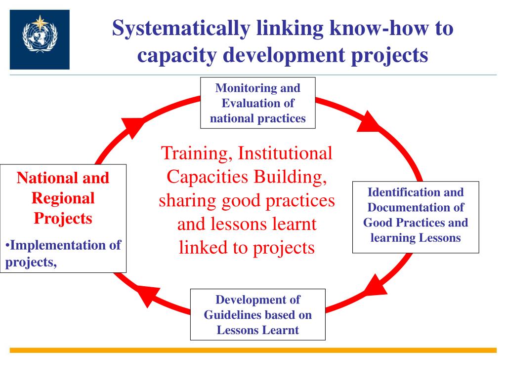 Systematically linking know-how to capacity development projects Monitoring and Evaluation of national practices Training, Institutional Capacities Building, sharing good practices and lessons learnt linked to projects • National and Regional Projects • Implementation of projects, Identification and Documentation of Good Practices and learning Lessons Development of Guidelines based on Lessons Learnt