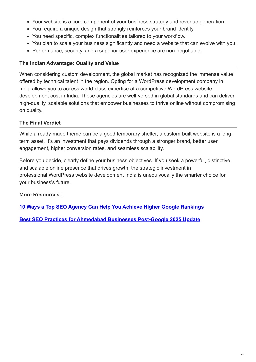 3. Your website is a core component of your business strategy and revenue generation. You require a unique design that strongly reinforces your brand identity. You need specific, complex functionalities tailored to your workflow. You plan to scale your business significantly and need a website that can evolve with you. Performance, security, and a superior user experience are non-negotiable. The Indian Advantage: Quality and Value When considering custom development, the global market has recognized the immense value offered by technical talent in the region. Opting for a WordPress development company in India allows you to access world-class expertise at a competitive WordPress website development cost in India. These agencies are well-versed in global standards and can deliver high-quality, scalable solutions that empower businesses to thrive online without compromising on quality. The Final Verdict While a ready-made theme can be a good temporary shelter, a custom-built website is a long- term asset. It’s an investment that pays dividends through a stronger brand, better user engagement, higher conversion rates, and seamless scalability. Before you decide, clearly define your business objectives. If you seek a powerful, distinctive, and scalable online presence that drives growth, the strategic investment in professional WordPress website development India is unequivocally the smarter choice for your business’s future. More Resources : 10 Ways a Top SEO Agency Can Help You Achieve Higher Google Rankings Best SEO Practices for Ahmedabad Businesses Post-Google 2025 Update 3/3