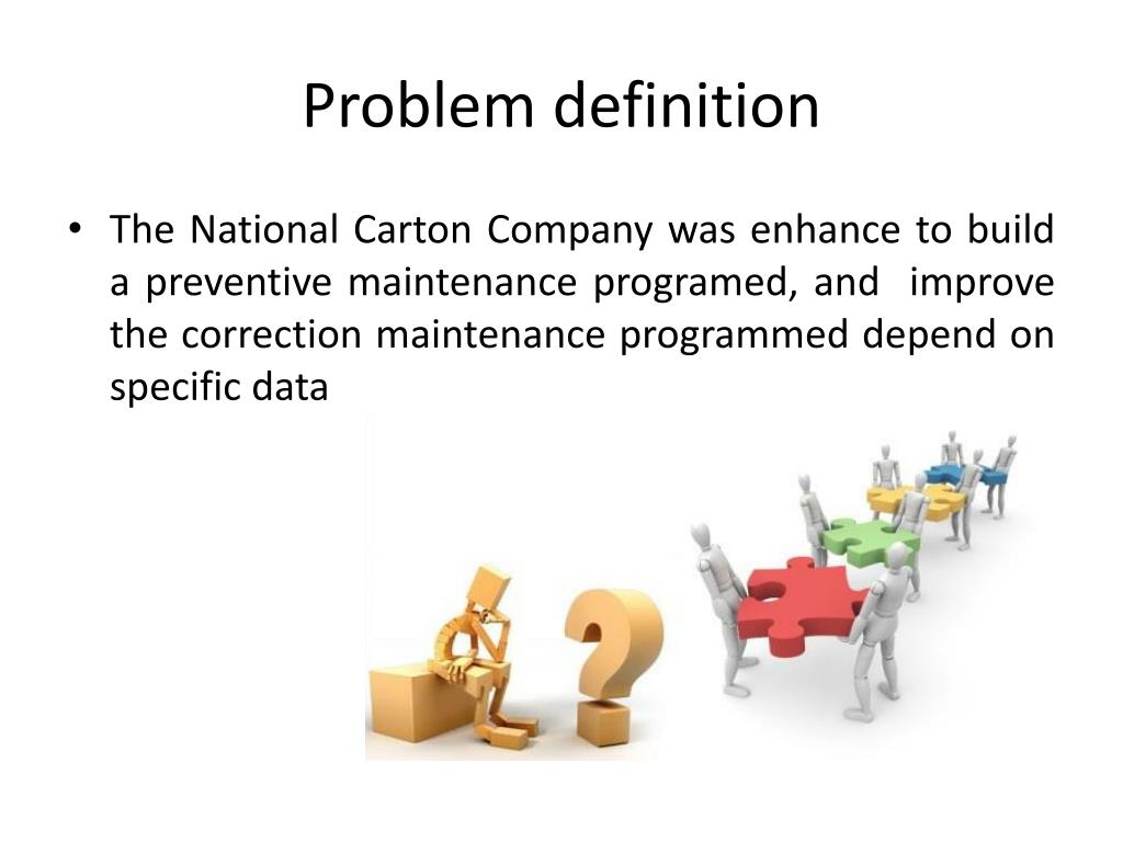 Problem definition • The National Carton Company was enhance to build a preventive maintenance programed, and improve the correction maintenance programmed depend on specific data