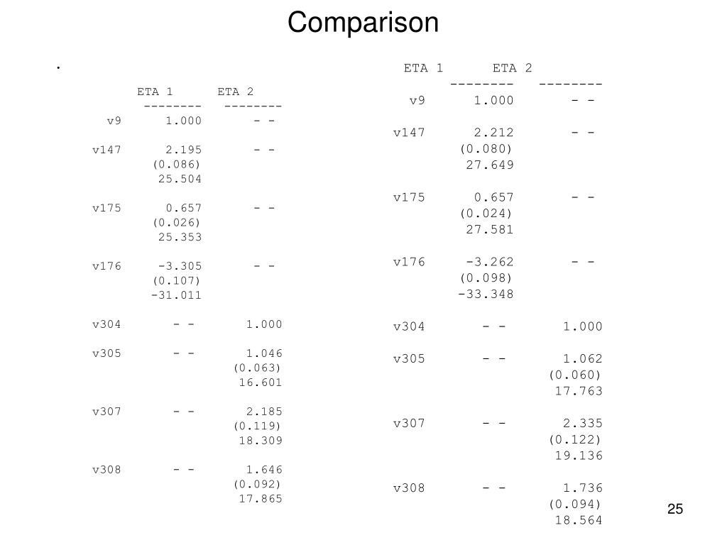 Comparison ETA 1 ETA 2 -------- -------- v9 1.000 - - v147 2.212 - - (0.080) 27.649 v175 0.657 - - (0.024) 27.581 v176 -3.262 - - (0.098) -33.348 v304 - - 1.000 v305 - - 1.062 (0.060) 17.763 v307 - - 2.335 (0.122) 19.136 v308 - - 1.736 (0.094) 18.564 ETA 1 ETA 2 -------- -------- v9 1.000 - - v147 2.195 - - (0.086) 25.504 v175 0.657 - - (0.026) 25.353 v176 -3.305 - - (0.107) -31.011 v304 - - 1.000 v305 - - 1.046 (0.063) 16.601 v307 - - 2.185 (0.119) 18.309 v308 - - 1.646 (0.092) 17.865
