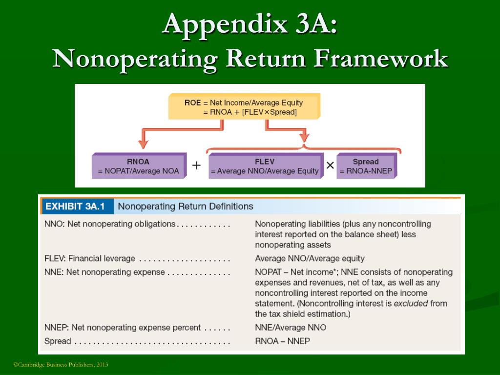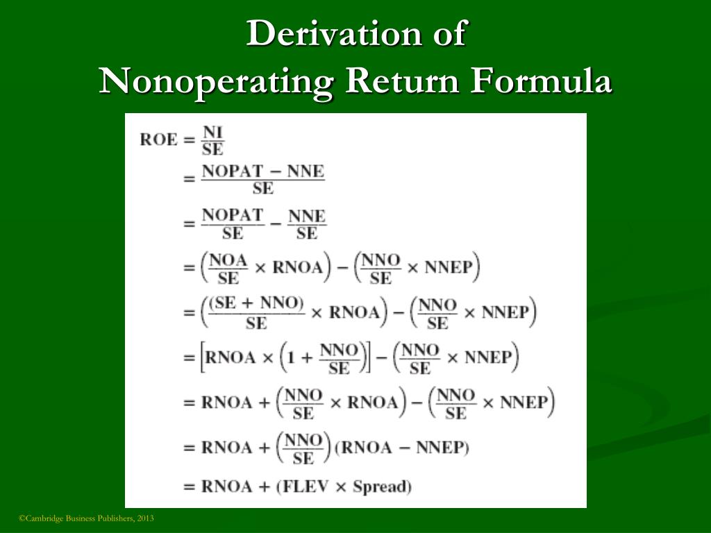 Nonoperating Return Component of ROE • Assume that a company has $1,000 in average assets for the current year in which it earns a 20% RNOA. It finances those assets entirely with equity investment (no debt). • Its ROE is computed as follows: