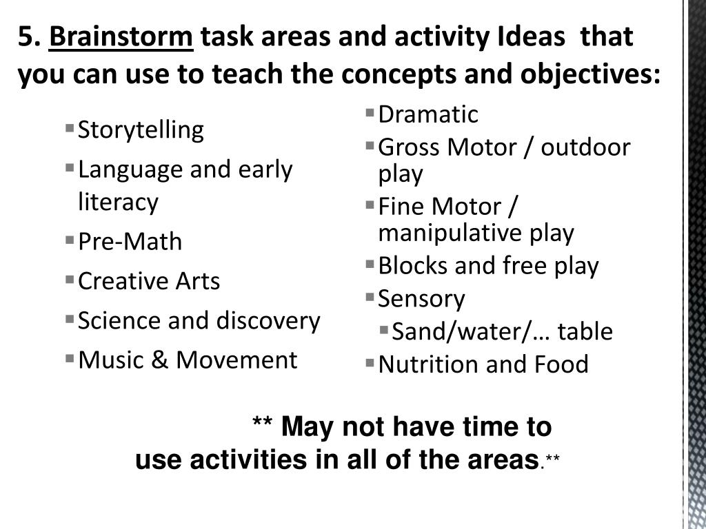 5. Brainstorm task areas and activity Ideas that you can use to teach the concepts and objectives: • Storytelling • Language and early literacy • Pre-Math • Creative Arts • Science and discovery • Music & Movement • Dramatic • Gross Motor / outdoor play • Fine Motor / manipulative play • Blocks and free play • Sensory • Sand/water/… table • Nutrition and Food ** May not have time to use activities in all of the areas.**