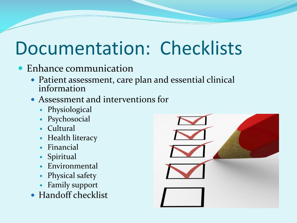 Documentation: Checklists • Enhance communication • Patient assessment, care plan and essential clinical information • Assessment and interventions for • Physiological • Psychosocial • Cultural • Health literacy • Financial • Spiritual • Environmental • Physical safety • Family support • Handoff checklist
