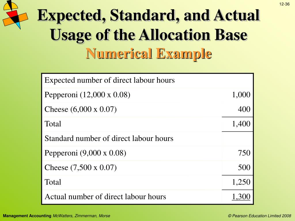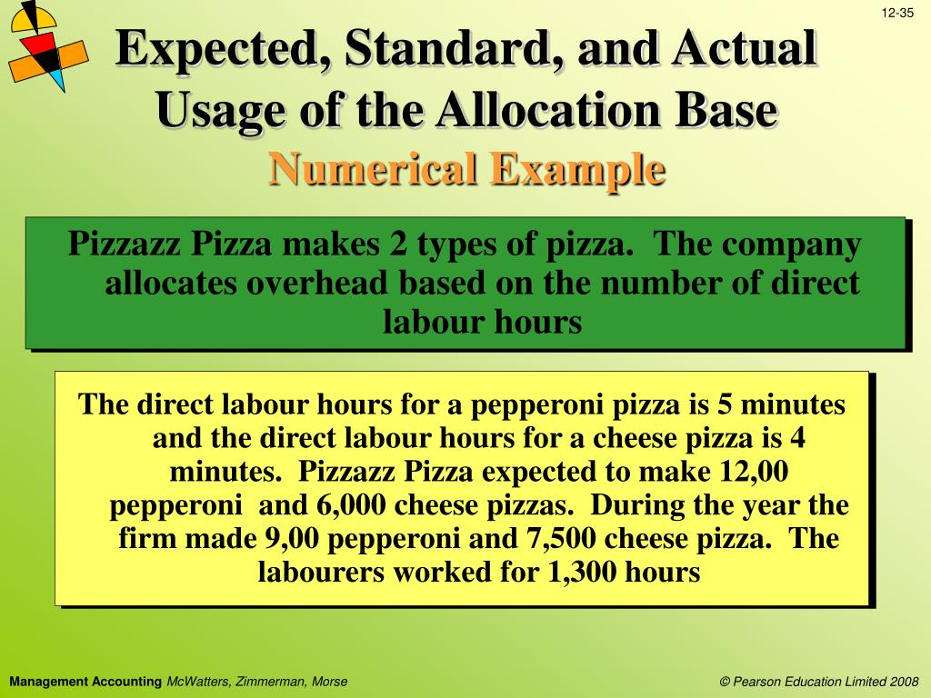 Expected, Standard, and Actual Usage of the Allocation BaseNumerical Example Pizzazz Pizza makes 2 types of pizza. The company allocates overhead based on the number of direct labour hours The direct labour hours for a pepperoni pizza is 5 minutes and the direct labour hours for a cheese pizza is 4 minutes. Pizzazz Pizza expected to make 12,00 pepperoni and 6,000 cheese pizzas. During the year the firm made 9,00 pepperoni and 7,500 cheese pizza. The labourers worked for 1,300 hours